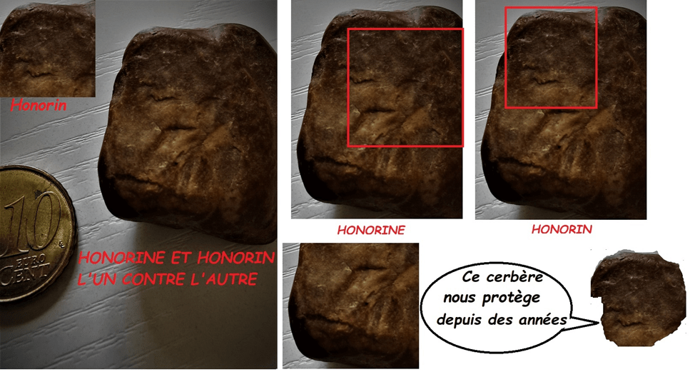 Représenté comme le roi d’un jeu de carte, Honorin a l’œil vif et un air jovial …. C’est moins vrai pour le cerbère qui les protège… En le voyant je me suis dit gaffe à tes doigts
