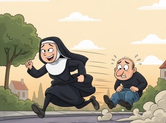 — Suite logique : un homme court plus vite qu’une nonne… il m’a rattrapée.
