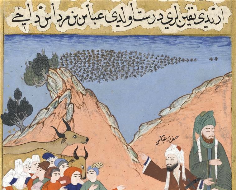 Ali (gendre du Prophète, turban vert) a ordonné aux abeilles d’Abbas (oncle du Prophète, turban blanc) de guider Mahomet et les premiers croyants lors de l’hégire de La Mecque vers Yathrib (Médine).